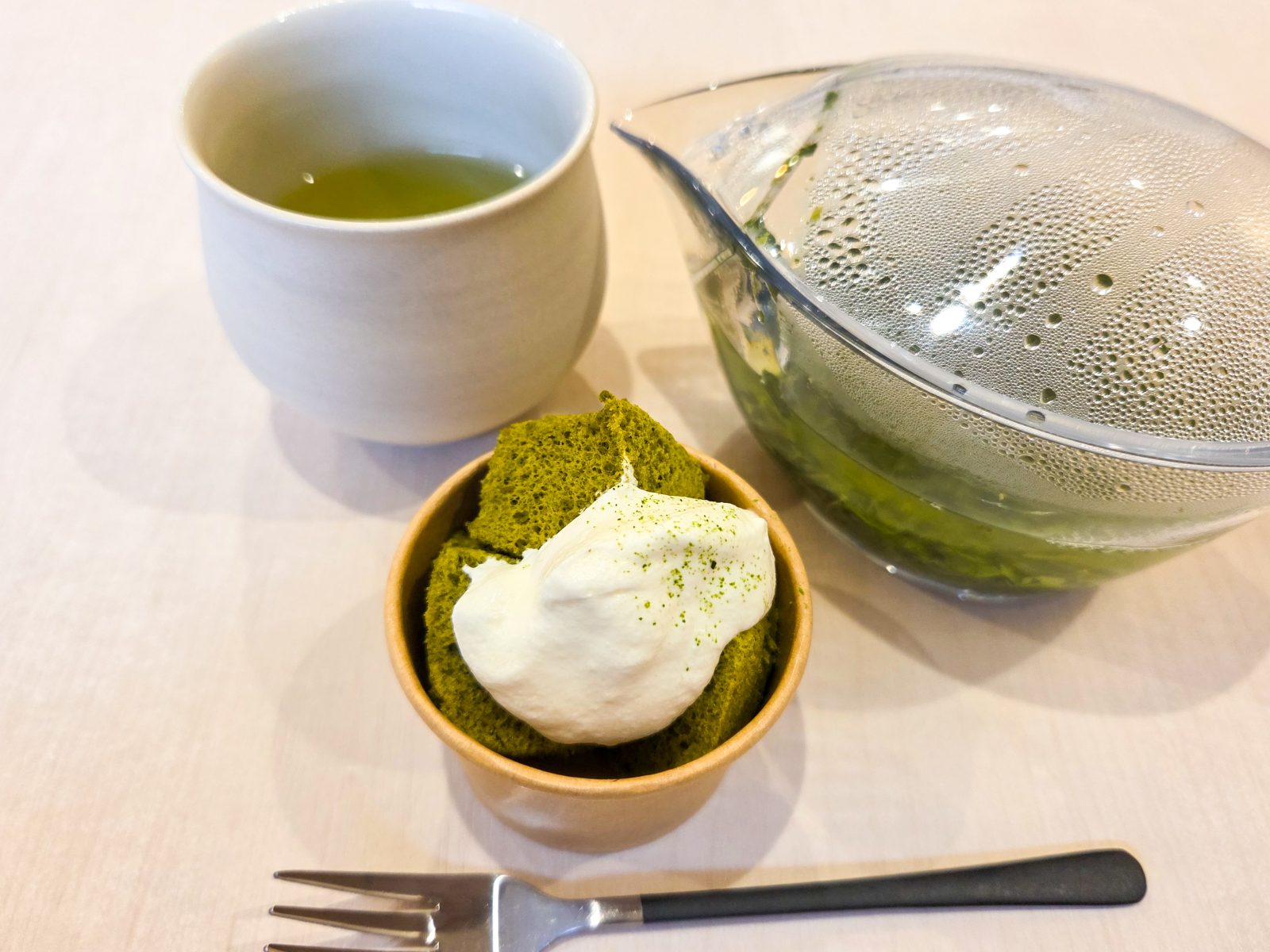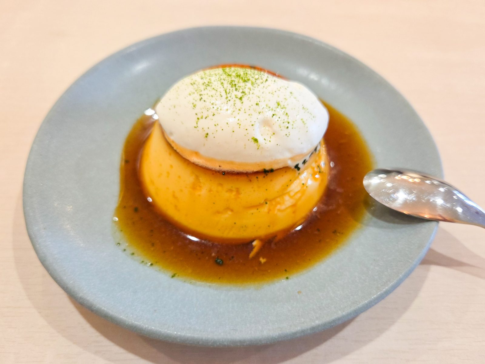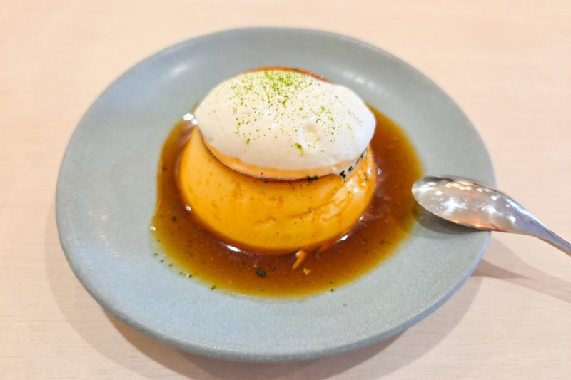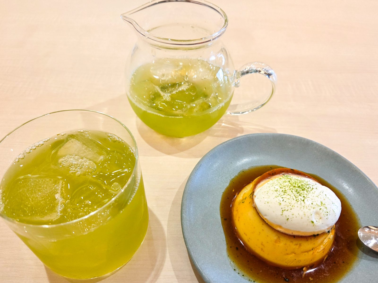 可能なプリンの上にかけてある生クリームにも、お茶のパウダーを掛けているなど、